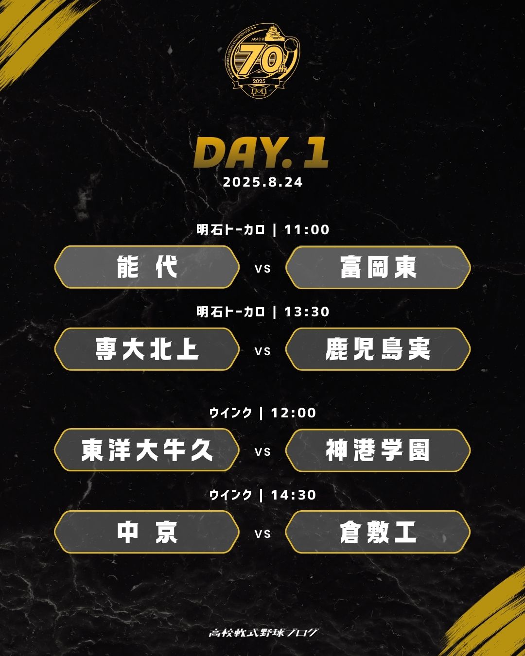 開会式後、明石から姫路に移動して行われる。初出場で3、2年生だけで臨む東洋大牛久(茨城/北関東)と開催県代表の神港学園(兵庫)が顔を合わせる。