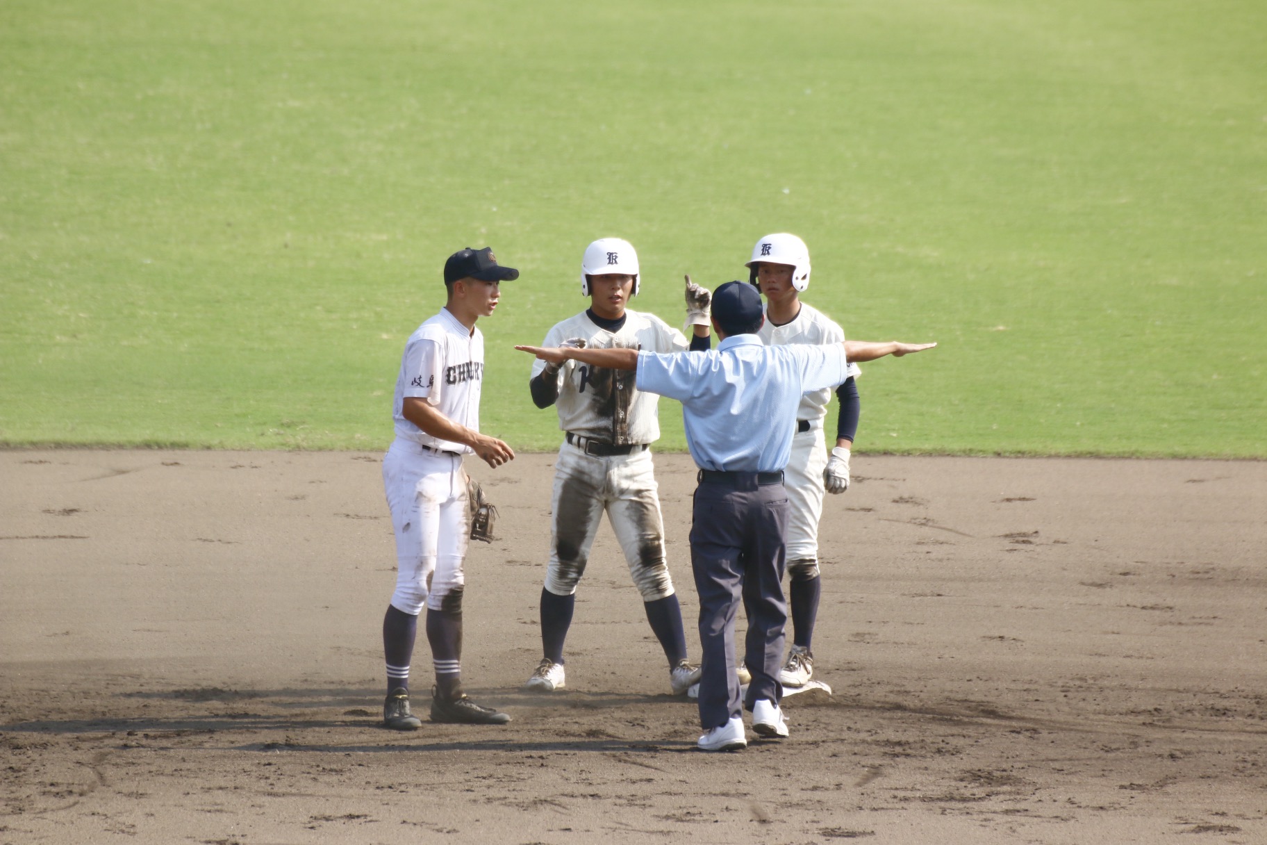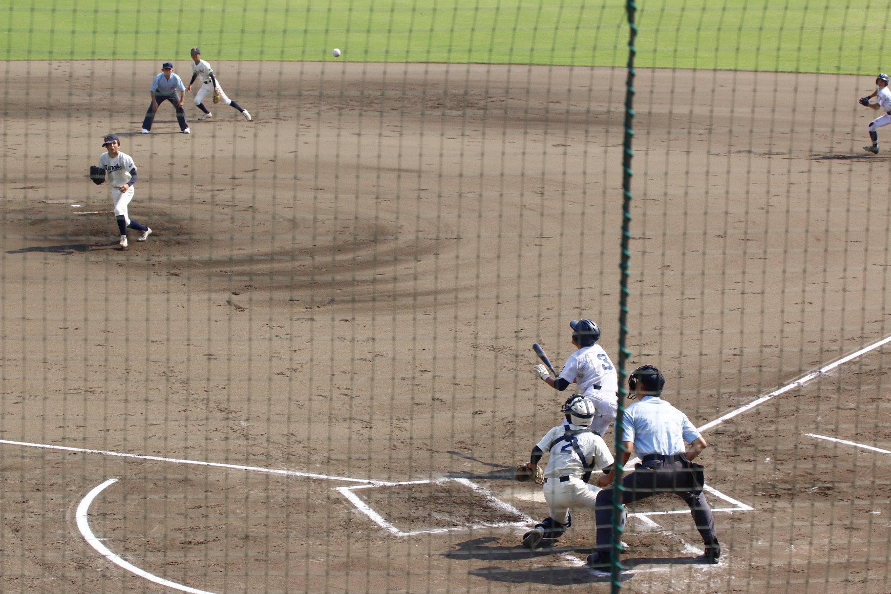 しかし2回表、二本の安打と四球で1死満塁とされると、曽川に中飛を放たれ、これをセンターが落球。しかし、すかさず二塁上に送球し、審議の結果、二走、一走が併殺となり、事なきを得る。