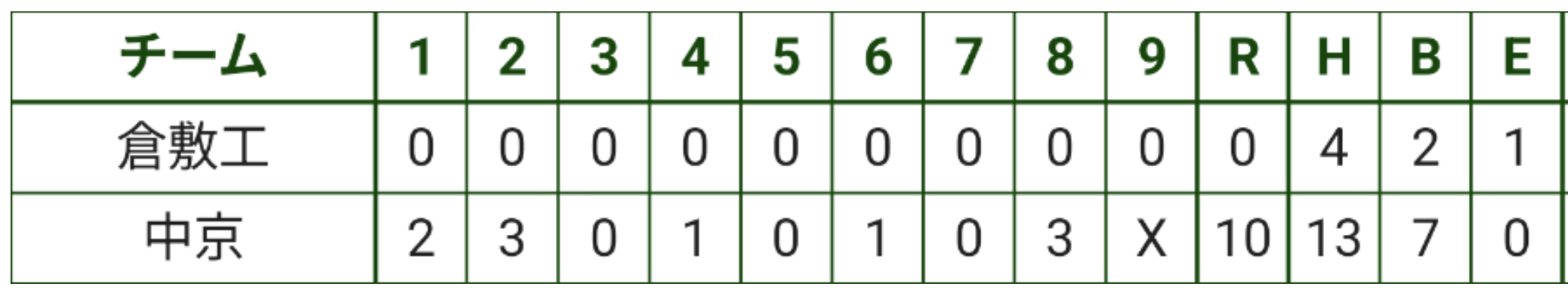 4回裏にも田口の適時打、6回裏はまた田口が叩きを決め、さらに2点を加えると、8回裏には藤田、中村駿の叩きに、内野の適時打で3点を加点し、得点を2ケタに乗せる(中京 10-0 倉敷工)。