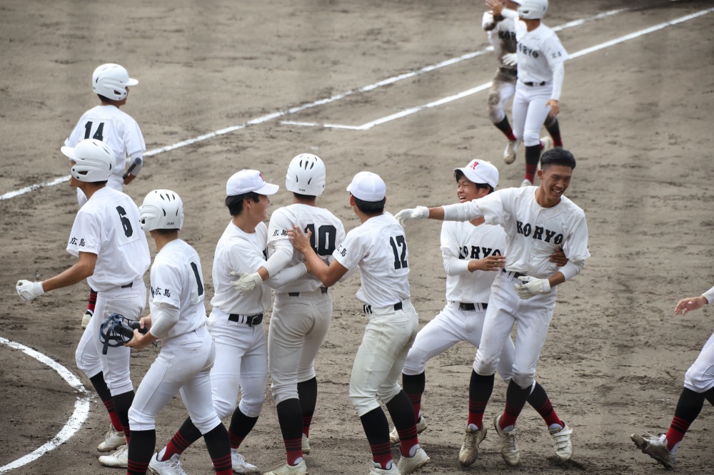 8回表、広陵は三振、内野ゴロ、三振でゼロで抑え、8回裏に1死満塁で投ゴロが本塁で封殺されて2死。ホームゲッツーを狙った相手捕手の送球が逸れる間に二走の岩岡がサヨナラの生還。夏の全国選手権では1回戦で敗退した広陵が、国スポで見事に勝利。30日の準決勝に進んだ。