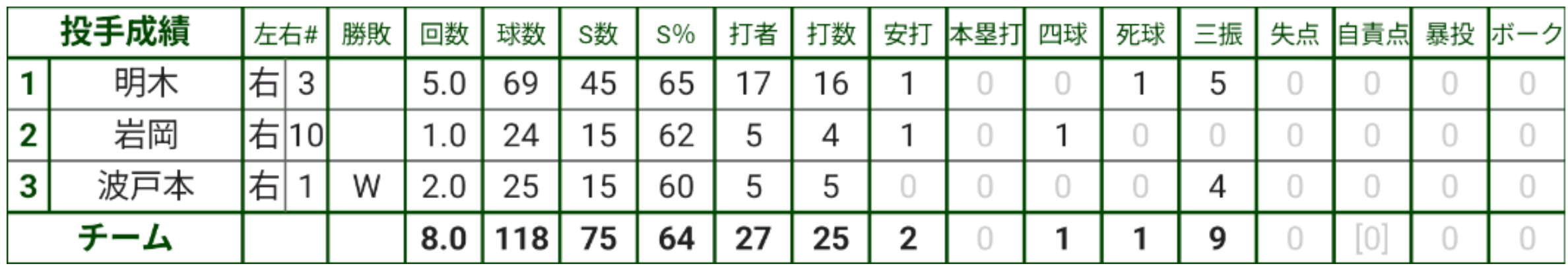 4回に2死一、三塁、6回にも2死三塁まで進まれたが、最後の1本を許さず。7回まで一度も1死三塁を作らせなかった。攻撃陣は相手の好投手に沈黙。7回に片木が絶妙なバント安打と盗塁で先制の機会をうかがったが、牽制死でチャンスを広げられなかった。