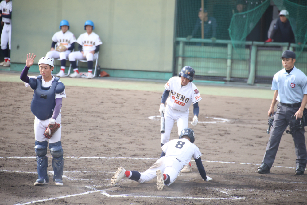 6回表にチーム初安打を放つも1点が遠い天理は無得点のまま9回の攻撃へ。先頭の金子がヒットで出塁。2死二塁と追い込まれたあと、西村が内野安打で2死一、三塁。続く橋口がファーストへの強襲ヒットで同点に追いつく(天理 1-1 あべの翔学)。