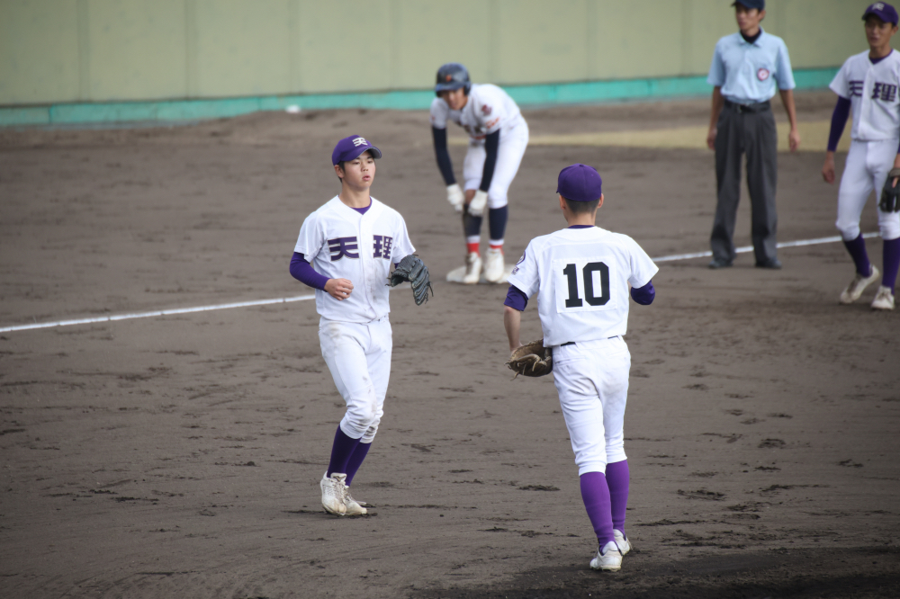 天理が最終盤で意地を見せた。初回から8回まで一度も三塁に進むことができず、最終回に初めて手にしたワンチャンスをものにした。新チームでは主将になった金子が毎回走者を許すも試合をつくり、背番号10の櫻井がつなぎ、エースの藤本が三度のピンチを切り抜けた。